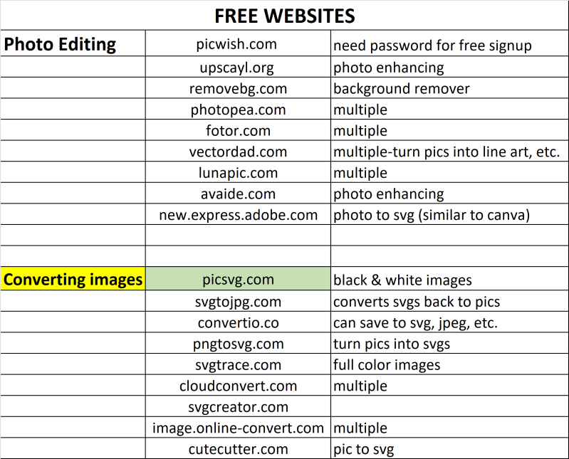 Here is the list I’ve compiled so far for various things, but what you’ll need is at the bottom: CONVERTING IMAGES. Sometimes it’s necessary to convert an image before uploading it into your cutting machine if the quality isn’t what you’d like it to be.